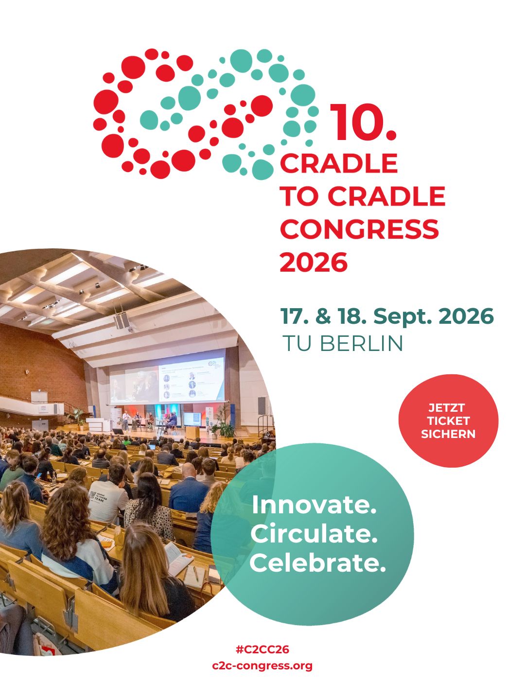Zukunft gestalten heißt, in Kreisläufen zu denken: beim 10. Internationalen Cradle to Cradle Congress! Am 17. und 18. September 2026 lädt Cradle to Cradle NGO über 1.000 Teilnehmende aus aller Welt zur größten Plattform für Cradle to Cradle und Circular Economy ein. Dich erwarten Debatten mit führenden Persönlichkeiten aus Politik und Wissenschaft, Best Practices globaler Unternehmen und innovativer Startups, inspirierende Keynotes zur Zukunft unserer Gesellschaft und die einmalige Gelegenheit, dich mit den prägendsten Köpfen der zirkulären Transformation zu vernetzen.